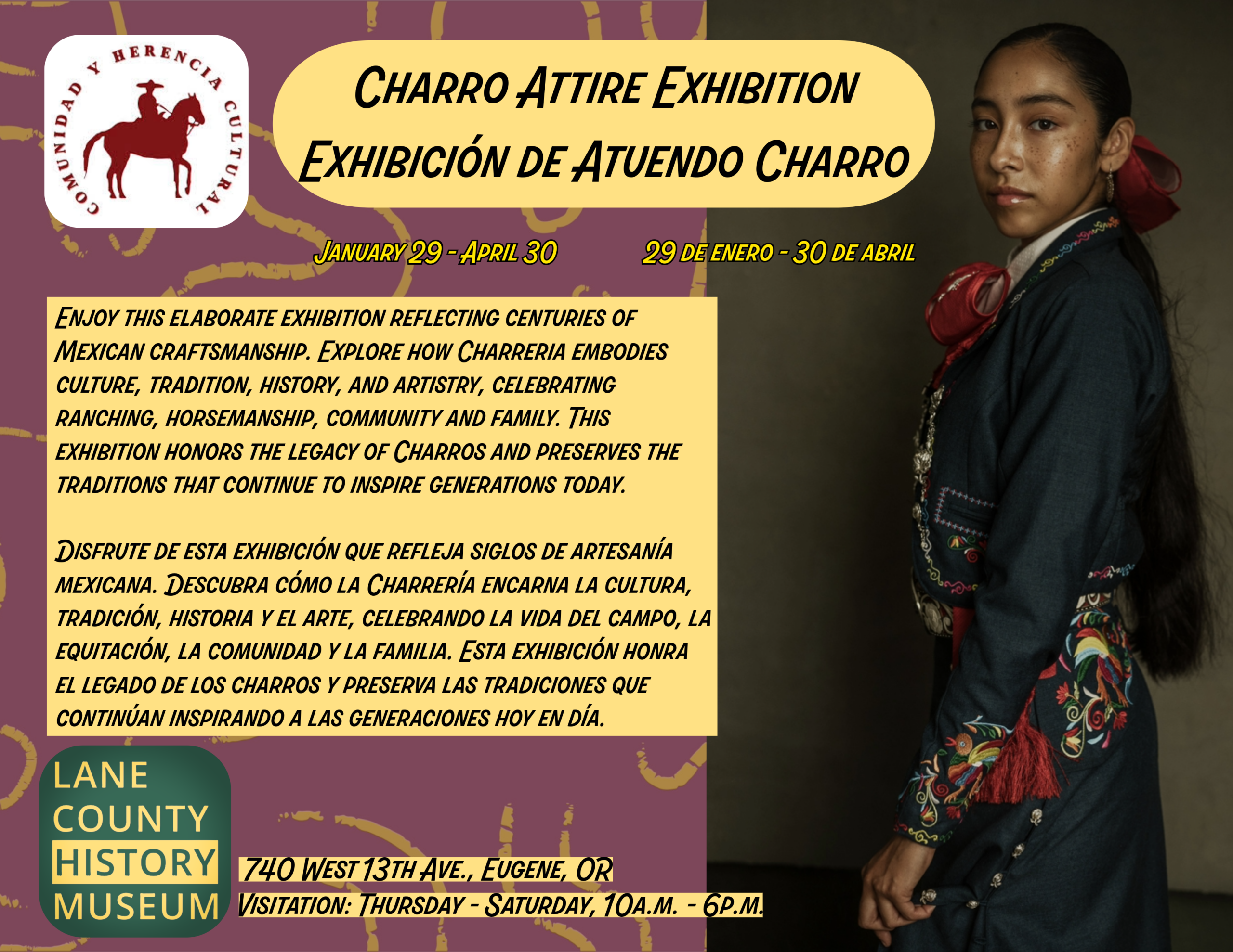 A temporary exhibit brought to us by Comunidad y Herencia Cultural. Featuring clothing and spotlights on Oregon Charros. On display January 29 to April 30th.