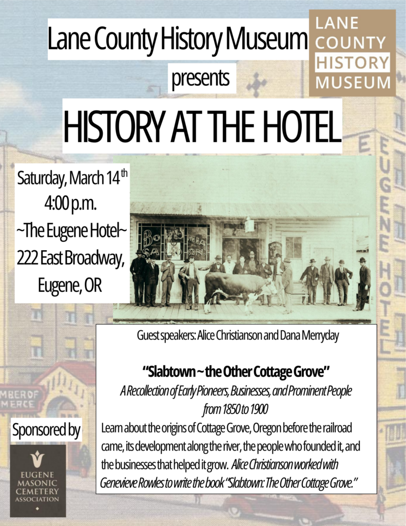 Every 2nd Saturday of the month at 4 pm, the museum will host presentations and talks related to Lane County and Oregon history. These will take place at the historic Eugene Hotel, located at 222 East Broadway in their 2nd floor lounge space.